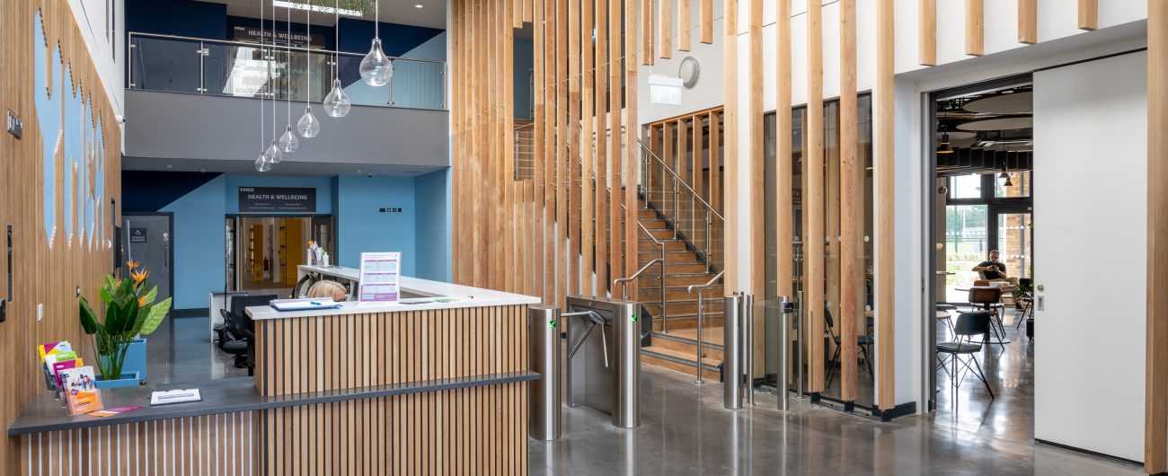 - The ground floor accommodates the main entrance lobby, reception and café area from which it splits into three distinct sections of the building:
